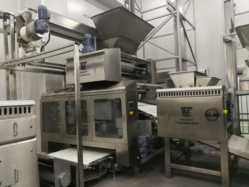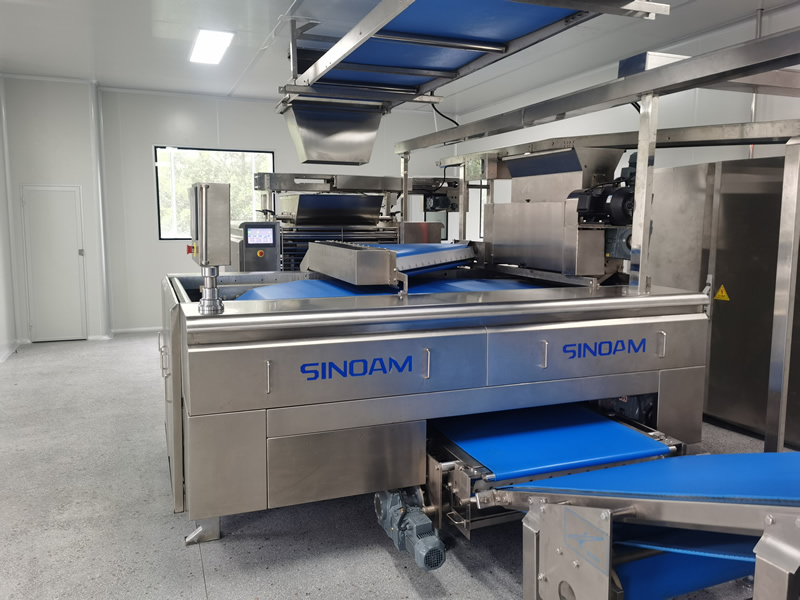 面團(tuán)通過疊層機三次壓軋,切片疊加至8~16層面皮。輸送至成型軋輥,該機能將回面始終處于面 皮底部,經(jīng)切片式疊層機生產(chǎn)出來的餅干層次感 強、口感松脆、酥化程度極高,配合機器上的撒 酥機,可生產(chǎn)蘇打餅干和其它高檔餅干。