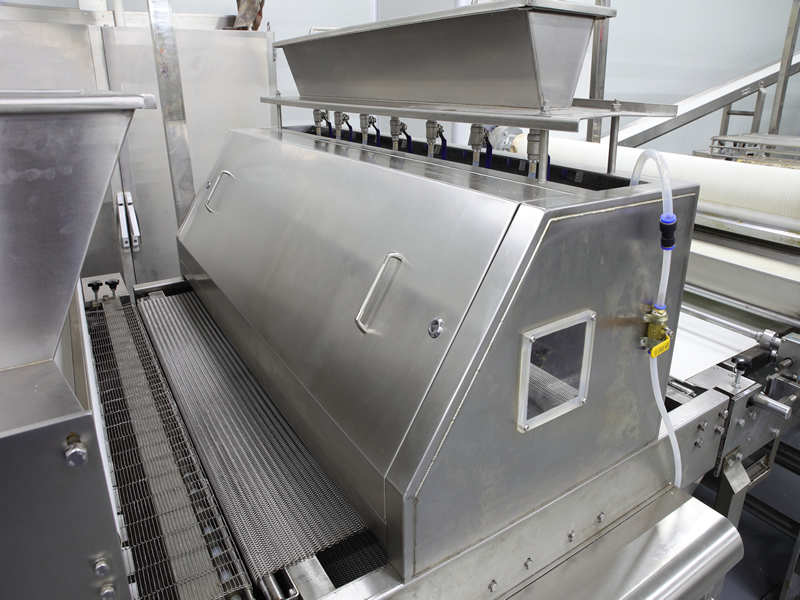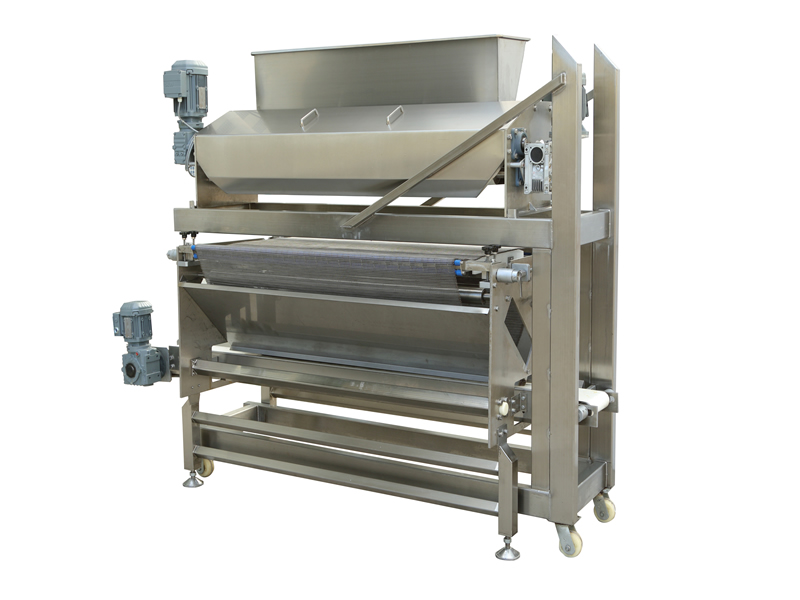 該設(shè)備應(yīng)用于將固體顆粒或者粉狀調(diào)味料,鹽,糖,芝麻及果仁片等撒布在面皮或則餅干上?;厥諜C回收多余的撒布物料循環(huán)利用。